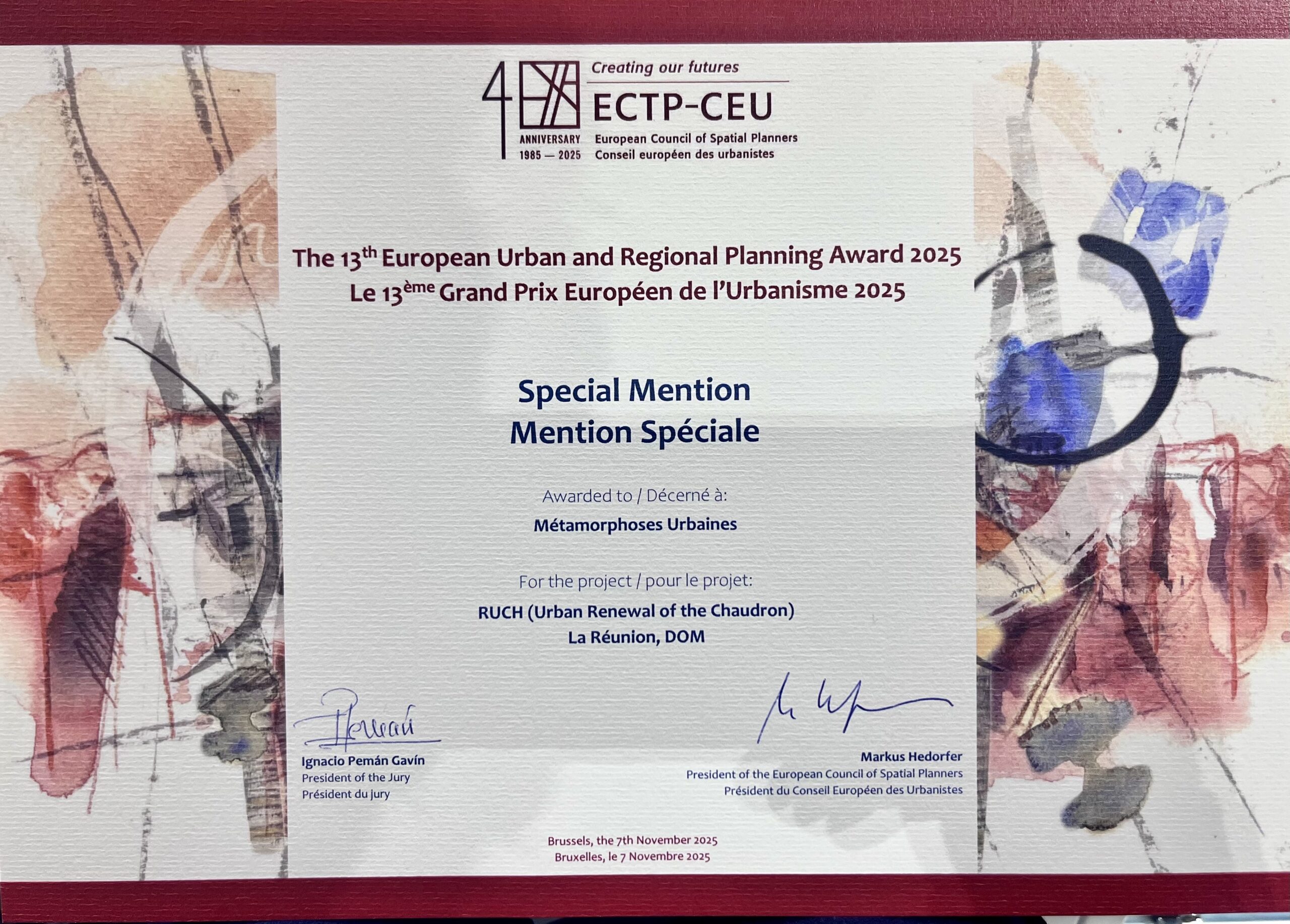 Ce vendredi 7 novembre 2025 on a entendu parler du Chaudron à Bruxelles. Le 13e prix européen de l’urbanisme, organisé par le Conseil Européen des urbanistes, a récompensé notre projet RUCH en lui octroyant la mention spéciale du jury ! En remettant ce prix prestigieux à trois membres de l’équipe, Samuel Gonçalves de la Ville de Saint-Denis, Enora Acheritogaray et Laurent Pinon de l’agence Métamorphoses Urbaines, le jury a souhaité distinguer le projet RUCH et mettre la lumière sur une nouvelle façon de faire de l’urbanisme.
